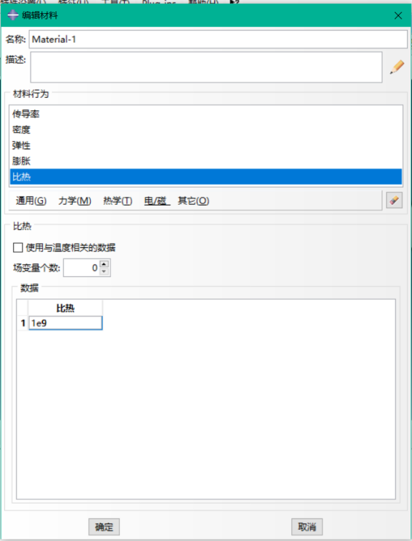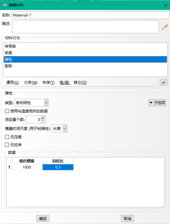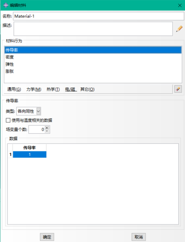 图5 编辑材料属性-传导率为1;密度为1e-9kg/mm3;杨氏模量1000;泊松比0.3;基本温度为20℃下膨胀系数1e-6;比热1e9