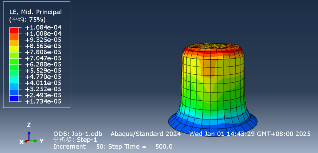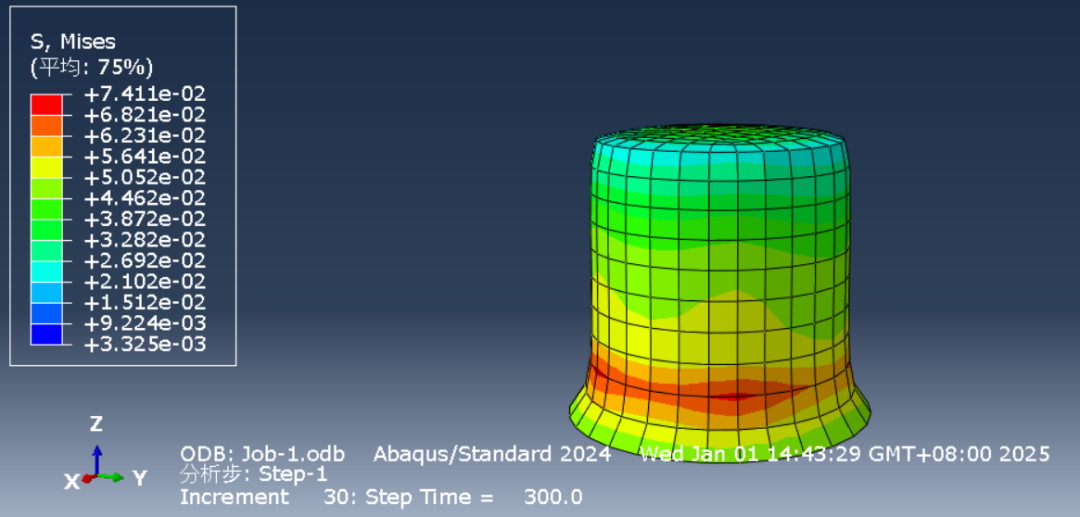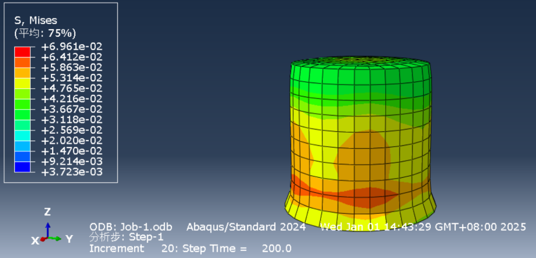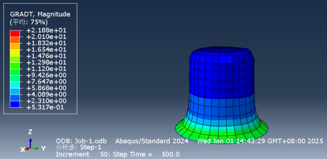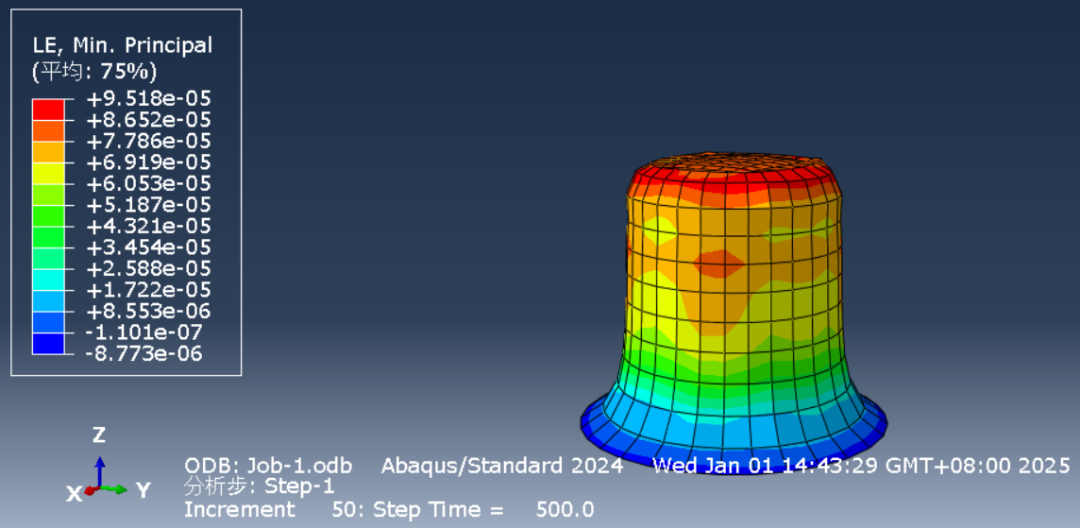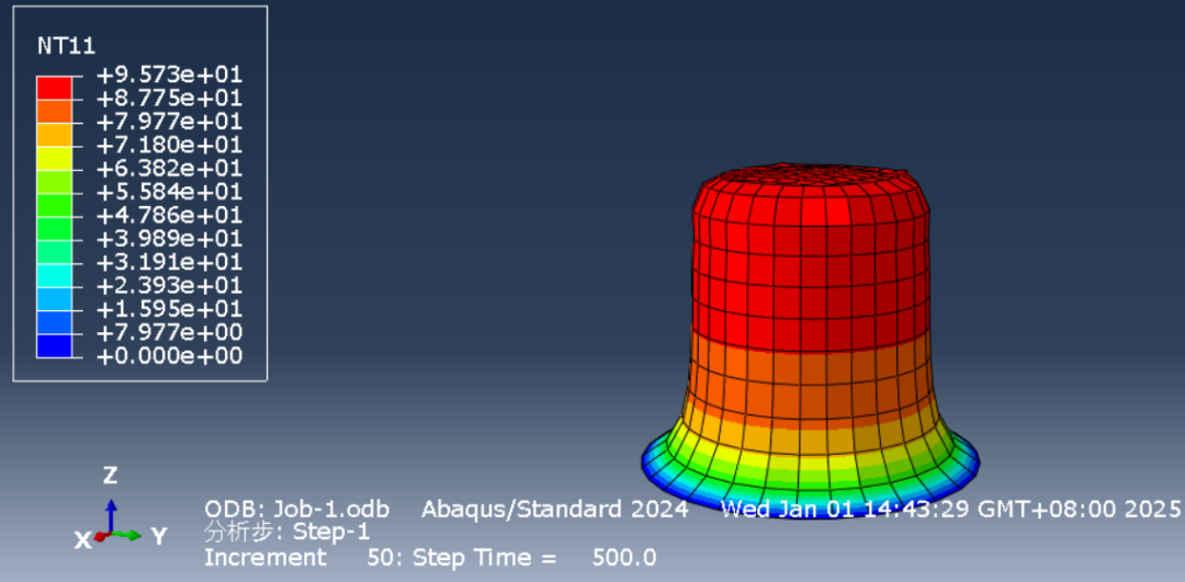 温度分布的分析:利用ABAQUS模拟冰块在不同温度梯度下的内部温度分布。通过设置初始温度条件和对流换热系数,可以研究薄膜内的温度场,为后续的应力分析提供基础。