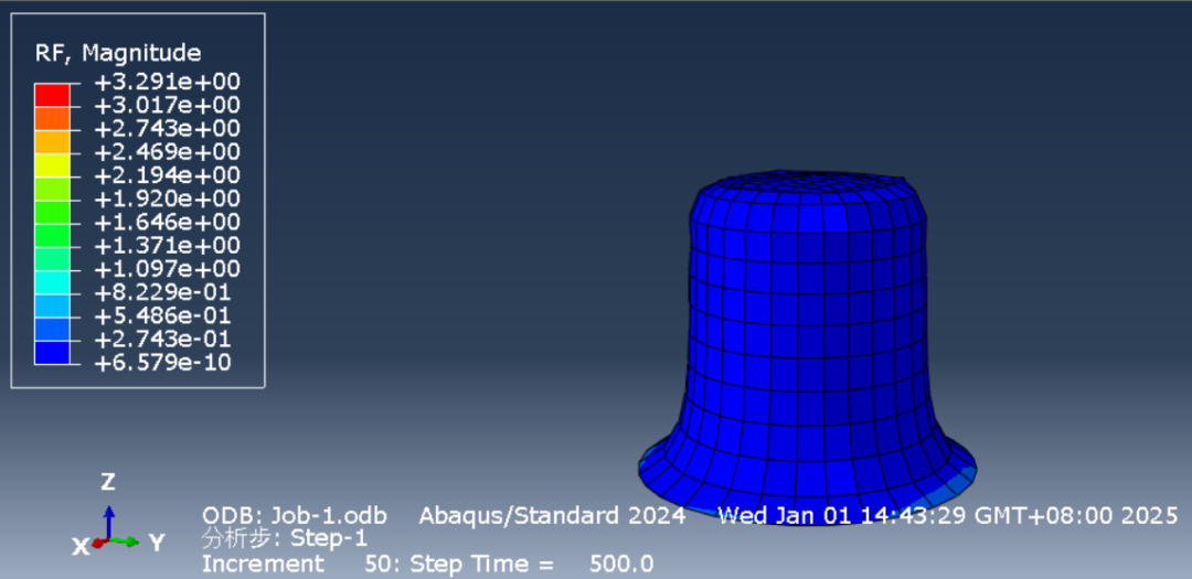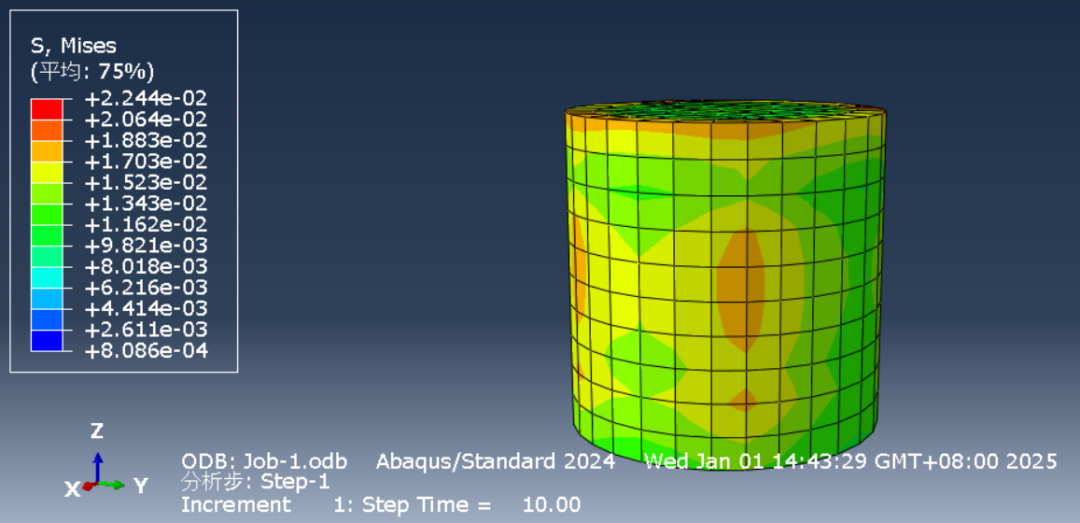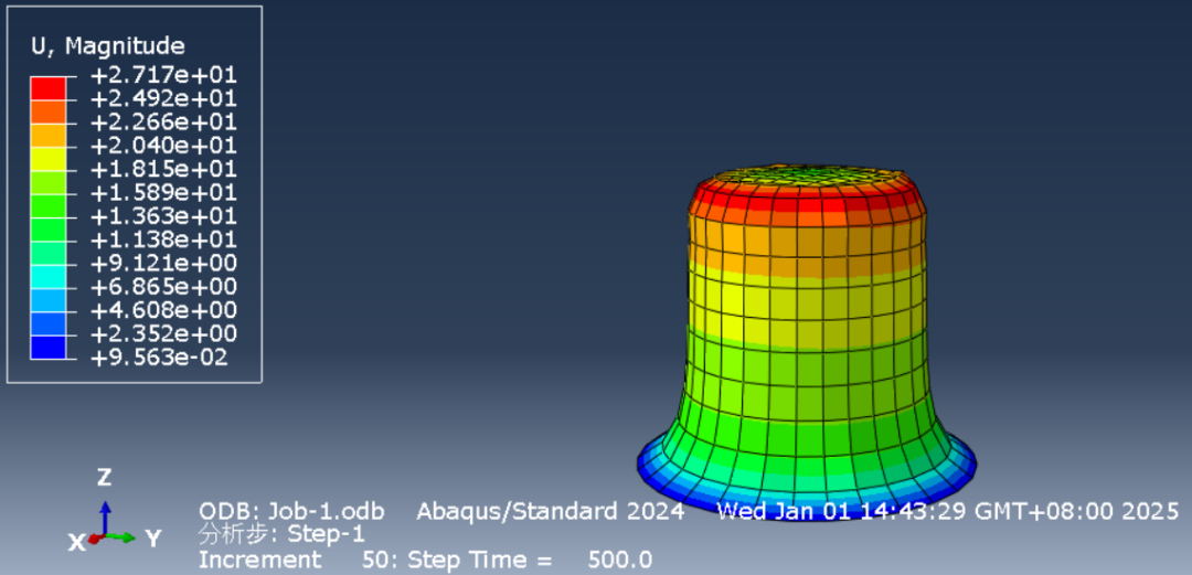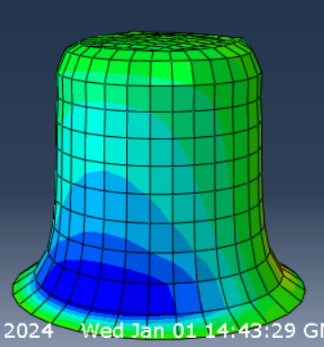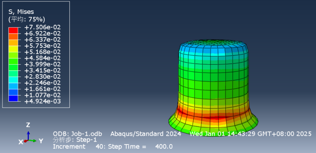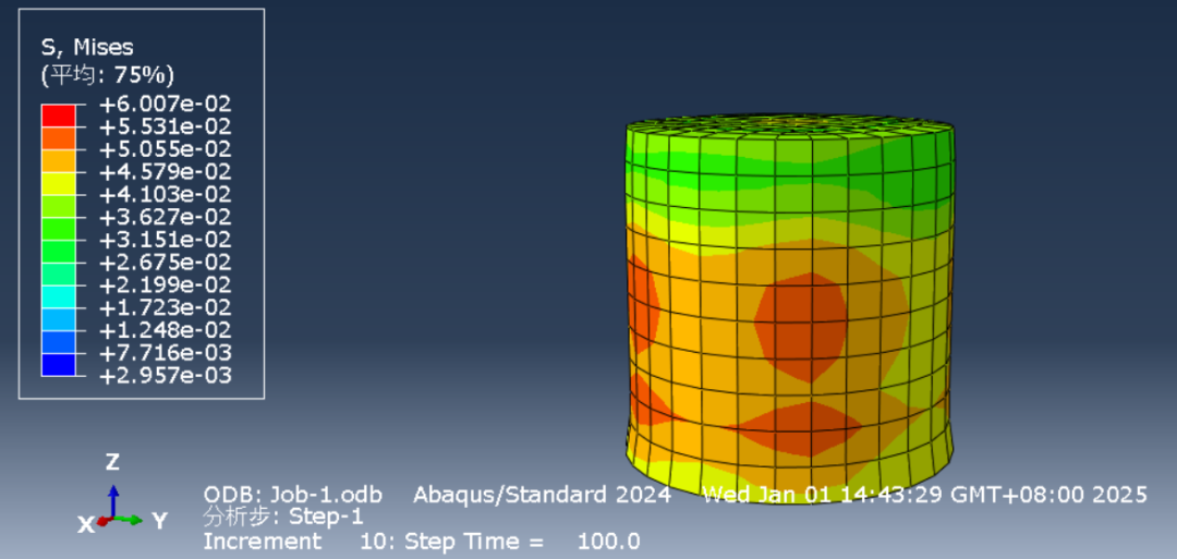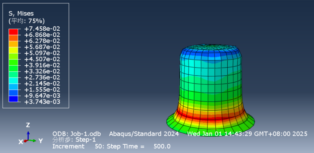 通过复刻案例,验证了ABAQUS是能够进行液体性质模拟的。本作业主要应用Umeshmotion子程序模拟高温下冰块的热传递和融化过程。使用ALE自适应网格控制,调用Umeshmotion子程序,来模拟高温下冰块的热传递和融化过程。得到应力、位移等性质变化云图,并且可通过可视化-动画-时间历程来动态的查看变化过程,后续将附以更加实际、复杂的条件,真实的模拟出冰块的融化过程情况,并进行分析。还有很多内容我还并不了解和理解,期待后续能够进一步学习使用有限元分析软件,用于项目课题中。