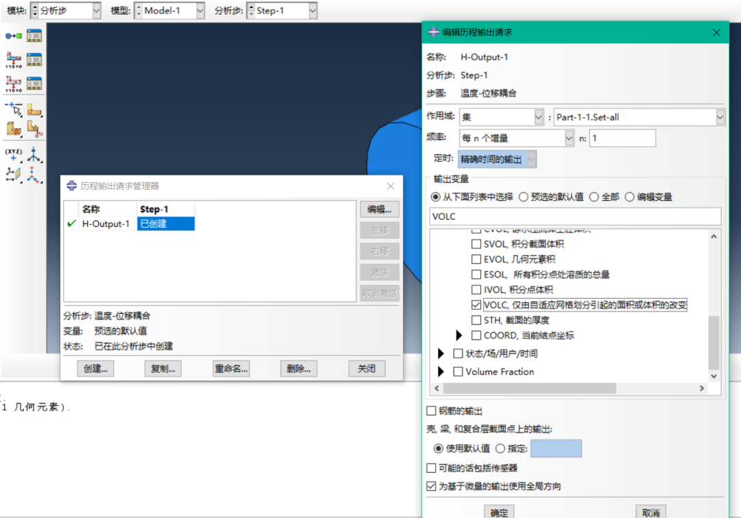 图14 历程输出请求编辑-作用域为“集”,输出变量为VOLC,仅由自适应网格划分引起的面积或体积的改变