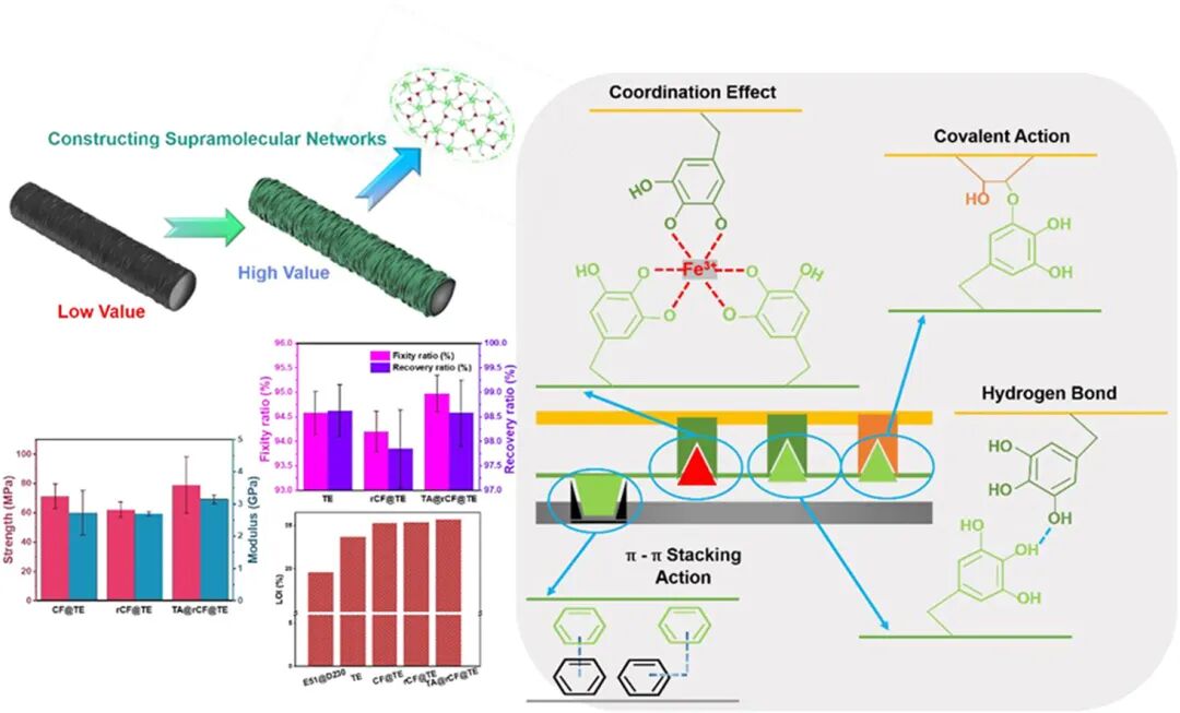 随着碳纤维复合材料使用量的不断增加,在生产和应用过程中产生的复合材料废弃物总是会对环境产生影响。通过对碳纤维复合材料进行热解,可以回收利用碳纤维,这也有利于碳纤维复合材料的可持续发展。与商用碳纤维(CFs)相比,再生碳纤维(rcf)的性能有所降低,一般主要用作低价值填料。为了提高再生纤维的应用价值,拓宽其应用领域,我们开发了一种简单、环保的改性技术,在再生纤维表面构建超分子网络。评价单宁酸固化环氧树脂(TE)制备碳纤维复合材料的应用效果。与rCF复合材料样品相比,超分子网络改性的rCF复合材料通过非共价界面和共价界面的协同作用实现了性能的提高:机械强度提高27.01%,形状记忆存储熵能密度提高8.95%,在高温条件下保持结构稳定性。本研究为再生碳纤维的广泛应用提供了新的技术途径。