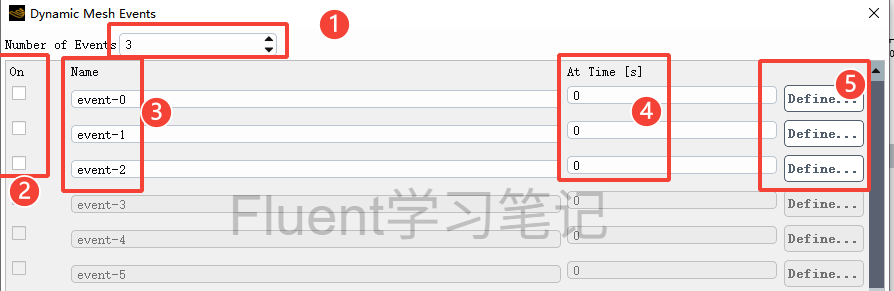 勾选Dynamic mesh,如果不需要动网格,则②处的选项都不勾选。③即Events