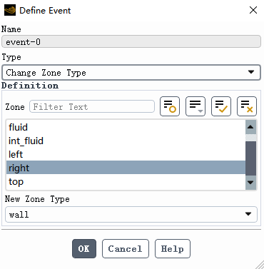 选择Change Zone Type,然后在zone处选择要更改的边界条件,New Zone Type选择改成的边界条件即可。然后就会在设定的时刻,更改边界条件。
