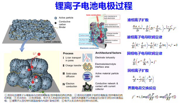 锂离子电池电极过程包括:①溶剂化的锂离子从电解液内迁移到电解液/固体电极的两相界面;②溶剂化的锂离子吸附在电解液/固体电极的两相界面;③去溶剂化;④电荷转移,电子注入电极材料的导带,吸附态的锂离子从电解液相迁移至活性材料表面晶格;⑤锂离子从活性材料表面晶格向内部扩散或迁移;⑥电子从集流体向活性材料的迁移。这些过程可以用经典的P2D模型来描述,在模型中:步骤①和⑤分别对应电解液和固相颗粒内部的离子扩散,由菲克定律描述,是造成浓度极化的主因。核心的界面过程③和④,即去溶剂化与电荷转移,被整合为Butler-Volmer动力学方程来描述,其反应速率强烈依赖于界面处的锂离子浓度和固相颗粒表面的电势,这直接决定了电化学极化的程度。步骤⑥的电子迁移,由于电极材料导电性好,通常简化为欧姆定律。