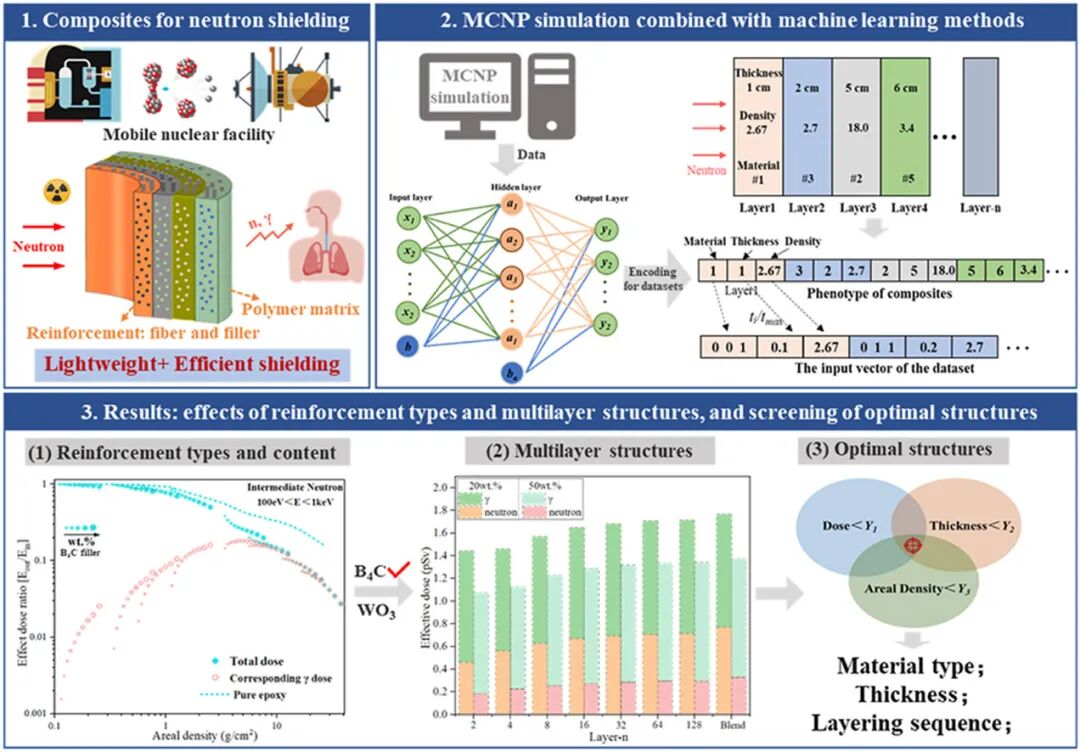 为了满足中子屏蔽和轻量化的要求,纤维增强聚合物基复合材料作为兼具结构和屏蔽能力的多功能材料具有显著的优势。由于其固有的多组分和多层结构,选择合适的增强材料和优化多层结构仍然是一个挑战。研究了用于中子辐射防护的多层复合屏蔽结构的设计与多目标优化。采用蒙特卡罗n粒子(MCNP)模拟方法对各种复合材料的辐射屏蔽性能进行了预测。本文首先采用均匀模型研究了典型屏蔽填料(B4C和WO3)在全中子能谱范围内对环氧树脂基体中有效中子剂量的影响。随后,利用理想分层结构模型阐明了环氧树脂基复合材料的材料组成策略和多层设计原则。结果表明,对于快中子防护,以高z材料为前层,富氢基质为后层的双层结构是最优的。对于慢中子防护,多层结构显示出显著的优势:与双层结构相比,128层结构可以减少多达30%的慢中子有效剂量。此外,将MCNP仿真与机器学习相结合,提出了多层结构的多目标优化策略,可以优化屏蔽效率、结构厚度和总质量。在六种回归算法中,选择了三层神经网络模型,实现了较高的预测精度。该方法优化了固定厚度下的最小剂量配置和固定剂量下的最小重量配置,为多层复合屏蔽提供了有效的设计指导。