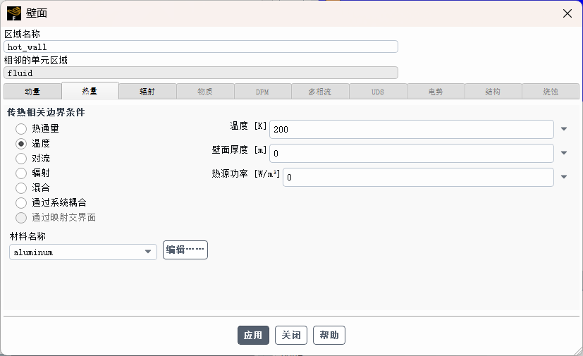 其次对热壁面边界进行设置,温度设置为200K,辐射设置为opaque边界,相关系数设置为1,扩散分数设置为1,具体设置如下图: