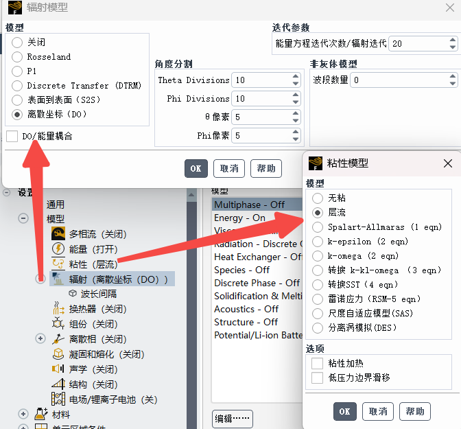 本案例所选用的模型为层流模型,辐射模型为DO模型,相关设置如下图所示: