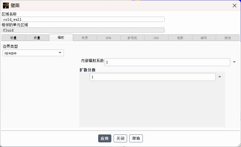 首先对冷壁面边界进行设置,温度设置为100K,辐射设置为opaque边界,相关系数设置为1,扩散分数设置为1,具体设置如下图:
