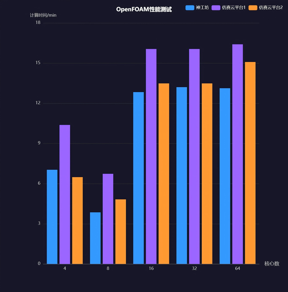SimForge™高性能工业仿真平台与其他几家仿真云平台的计算时间如下图所示。