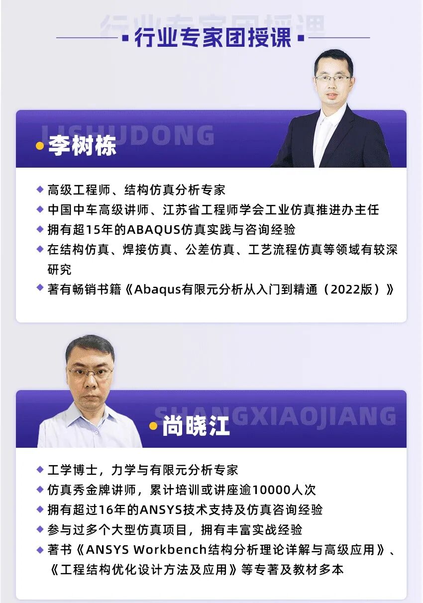 由畅销书《Abaqus有限元分析从入门到精通》作者领衔,联合工学博士、力学专家组成导师团。他们平均拥有超过15年工程仿真经验,不仅教你软件操作,更传授工程思维。