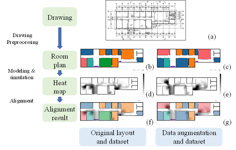 最后,为扩充样本,在保持走廊、楼梯、出口不变的前提下,通过随机调整部分房间功能、重新标注密度的方式进行数据增强,使一张原始图纸可衍生出4–5张不同功能布局图,最终构建出399份带功能与密度标注的平面样本。
