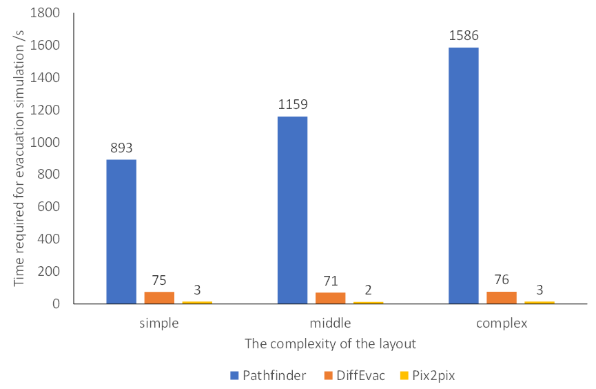 在方法层面,本文系统对比了U-Net、pix2pix、pix2pixHD等典型生成模型与扩散模型在疏散热图生成任务上的表现。结果表明,基于特征张量表示的扩散模型DiffEvac明显优于现有方法,对复杂、不规则平面具有更好的泛化能力。且DiffEvac对单个新平面的推理时间约为2分钟,相比传统Pathfinder建模与仿真的20分钟左右提升约一个数量级,在不同复杂度样本上均保持稳定的时间优势。
