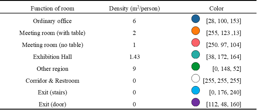 基于这些CAD图纸,团队先剔除结构、施工等无关图层,仅保留墙体、门窗洞口并转为RGB图像。同时依据《办公建筑设计标准》和《图书馆建筑设计规范》为不同功能房间分配人员密度,并为每一类房间指定颜色,将“房间功能 + 占用密度”嵌入到同一张平面图中,如表1所示。