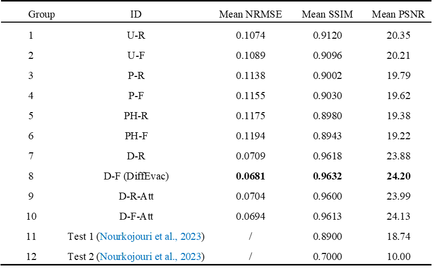(1)使用扩散模型并结合解耦特征表示的 “D-F”(即 DiffEvac)在三项指标上均表现最优。相较既有方法,SSIM最高提升约37.6%,PSNR提升可达约142%。