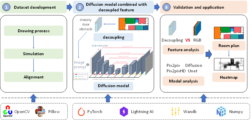 在数据层面,研究团队收集了81份真实办公建筑平面,并通过功能置换与规范化人群密度标定扩展为399组“功能平面–疏散热图”样本。与以往直接使用彩色图像不同,DiffEvac 将平面信息拆解为“障碍-人群密度-出口位置”三通道特征张量,显式编码与疏散行为高度相关的几何与功能信息,显著降低了模型从原始图像中“自己猜语义”的难度。