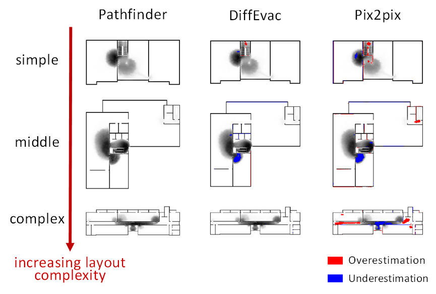 研究还比较了DiffEvac在不同平面复杂度下的表现,并与pix2pix模型作对比。结果发现:随着房间和出口数量增多、布局愈加复杂,pix2pix的预测精度明显下滑,而DiffEvac在简单到复杂的各类平面上表现都比较稳定。这说明本方法在应对复杂真实建筑时泛化能力更强,用作疏散仿真代理更可靠。
