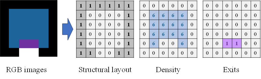 既有研究通常是把CAD图“涂成一张彩色图”:不同构件用不同RGB颜色编码,但墙体、人群密度、出口位置等物理信息都混在颜色里,模型既看不清重点,学习也更吃力。为此,本研究提出了一种“解耦特征表示”方法,把原本混在一张图里的关键信息拆成三层输入:障碍层(墙体等不可通行区域标记为1,其余为0),人群密度层(根据房间功能填入对应占用密度),出口位置层(楼梯、外门像素标记为1,其余为0)。三层与原始RGB图保持相同分辨率和尺度,但各自专注一类物理含义,既降低了学习难度,又让模型聚焦在真正与疏散相关的要素上。
