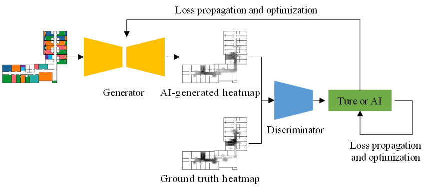 本研究选取了近年在图像生成领域表现突出的扩散模型:先把一张真实图片一步步“加噪声”直至完全变成噪声,再训练一个深度神经网络学会如何把这团噪声一点点“洗干净”,最终还原出目标图像。具体实现上,本文采用U-Net作为去噪网络,并加入注意力机制。通过学习Pathfinder大量仿真得到的疏散热力图,最终实现用扩散模型代替传统仿真软件,从功能分区平面直接生成高质量疏散热力图。