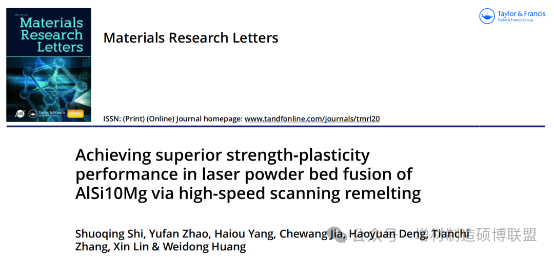 西北工业大学林鑫教授团队在深刻理解快速凝固理论的基础上,充分发挥激光增材制造的极端工艺条件,以最为常见且价格低廉的AlSi10Mg合金为对象,开发出一种原位高速重熔策略(HSSR),使得晶粒发生显著的柱状晶→等轴晶转变(CET),同时获得更加细化的晶内胞状亚结构,提高了Al基体中纳米析出相的体积分数,实现了增材制造铝合金的强-塑性突破。制备出的铝合金试样具有优异的表面光洁度以及内部冶金质量;屈服强度为279.5 ± 2.3 MPa,抗拉强度为496.1 ± 5.8 MPa,断裂延伸率为21.4 ± 0.9%,综合拉伸性能在目前已知的所有增材制造铝硅合金及复材中表现最为优异。相关工作以题为“Achieving superior strength-plasticity performance in laser powder bed fusion of AlSi10Mg via high-speed scanning remelting” 的研究论文发表在Materials Research Letters上。论文第一作者为西北工业大学材料学院博士生史硕晴,通讯作者为林鑫教授、赵宇凡教授以及杨海欧副研究员,第一通讯单位为西北工业大学凝固技术国家重点实验室。
