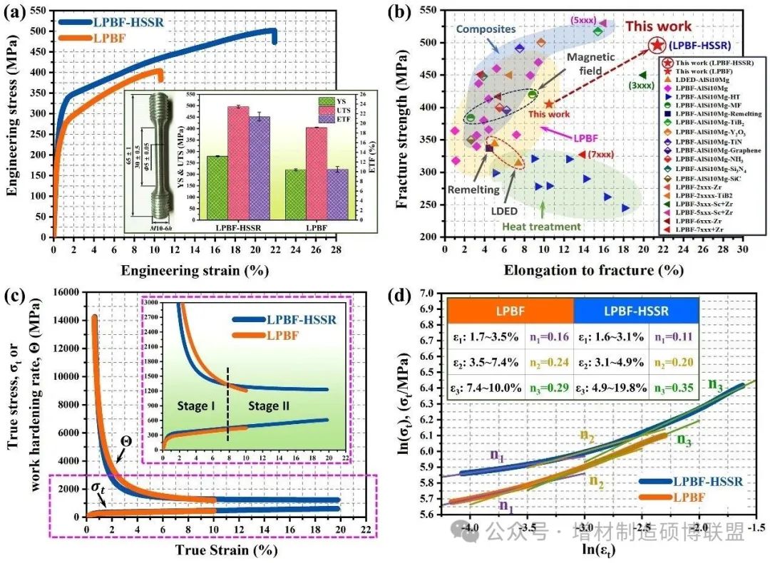 本研究创造性提出的原位高速重熔策略(HSSR),是一种简单易行、稳定可靠、成本低廉的调控手段。HSSR策略促进了晶粒以及晶内胞状亚结构的细化和等轴化。通过较硬等轴晶和较软柱状晶间协调变形,有效缓解了熔池边界的应变局部化,延迟了脱粘,提升了试样延展性;同时晶粒及晶内胞状亚结构的细化、以及Al基体内纳米析出相比例提升,有效改善了加工硬化能力,使拉伸强度提升。这一成果不仅使得增材制造铝硅合金获得了前所未有的拉伸性能,还有望为增材制造其他类型合金的性能提升开辟一条新的技术途径,具有巨大工程应用潜力。