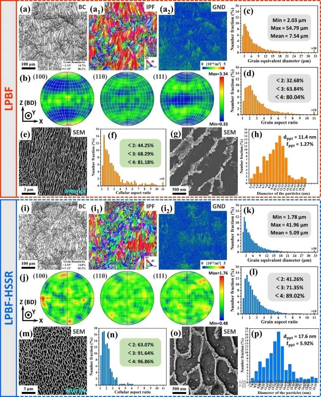 在本工作中,对常规激光选区熔化(LPBF)试样以及高速重熔策略(HSSR)试样进行了对比研究。通过微观组织分析可知(图1),非重熔LPBF试样具有强烈的 <100> 织构,Al基体内部析出相不显著。相比之下,HSSR试样的熔池区域边界不明显;等轴晶比例显著提升,呈现出柱状晶-等轴晶混合形态,并且GND更多的分布在熔池内部。HSSR策略后,晶粒的 [001] 取向被削弱,各向异性程度显著降低;晶内胞状亚结构的等轴化趋势加强;且Al基体内部弥散分布大量的纳米析出颗粒。通过分布直方图统计数据可知,HSSR策略促进了晶粒以及晶内胞状亚结构的细化和等轴化。