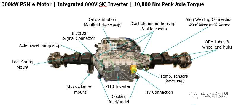同轴设计的执行需要驱动轴穿过电动机的中心。根据指定的轴扭矩,所需的驱动轴直径并不总是允许这样做或需要特殊的电动马达轴设计。图中显示了集成逆变器,位于车轴的后部。