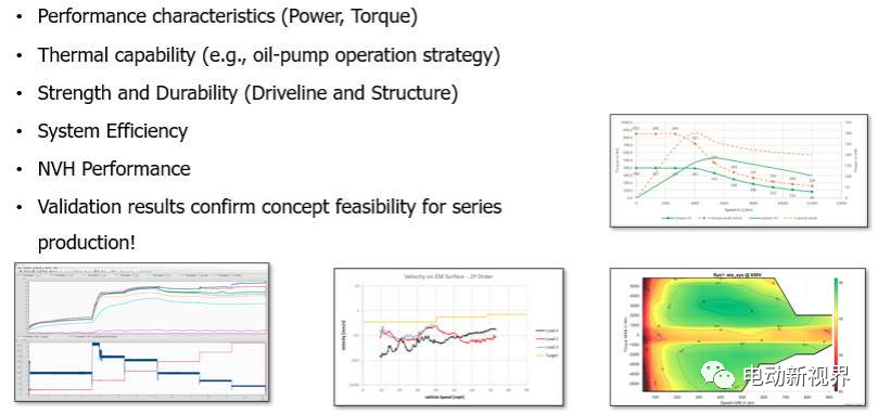 效率测试显示系统峰值值为95%及更高。模拟连续上坡拖车拖曳事件评估热能力。油温不超过100℃大关。最大扭矩和3G垂直加载的强度测试成功完成,故障测试符合模拟。基于假设工作周期的耐久性测试仍在进行中。第一次NVH测量显示的结果低于零至最大值之间的内部验收标准。车辆速度。通过物理负载接触模式确认负载下的模拟齿轮偏转。