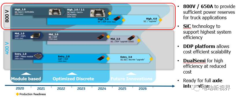 由于效率对于具有高功率消耗的重型卡车非常重要,采埃孚决定在其电驱动桥(EBEAM)系统中使用800V SiC逆变器。采埃孚的模块化逆变器产品路线图不仅可以在不同的芯片材料,即Si或SiC之间进行选择,还可以在不同的电源模块之间进行选择。使用DDP(双离散平台),可以使用不同功率额定值的电源模块,并允许根据它们集成的相应电驱动桥系统的需求定制逆变器。