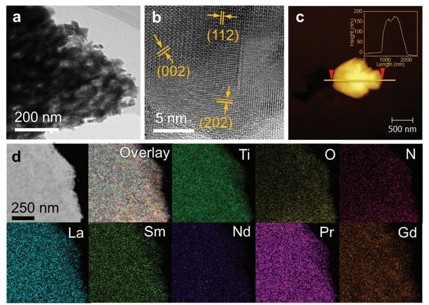 (a)HE-LnTiO₂N的透射电子显微镜成像图;(b)高分辨透射电子显微镜图像;(c)原子力显微镜形貌图,插图为高度剖面;(d)高角环形暗场-扫描透射电子显微镜成像图及相应的能量色散X射线光谱元素分布图。