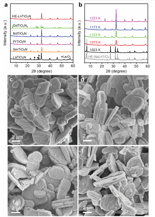 (a)HE-LnTiO₂N与LnTiO₂N(Ln=Sm、La、Pr、Nd或Gd)的X射线衍射图谱;(b)HE-NaLnTiO₄前驱体及在不同氮化温度下处理3小时后所得产物的X射线衍射图谱;(c–f)在c) 1073 K、d) 1123 K、e) 1173 K和f) 1223 K的氮化温度下处理3小时后所得产物的扫描电子显微镜成像图。
