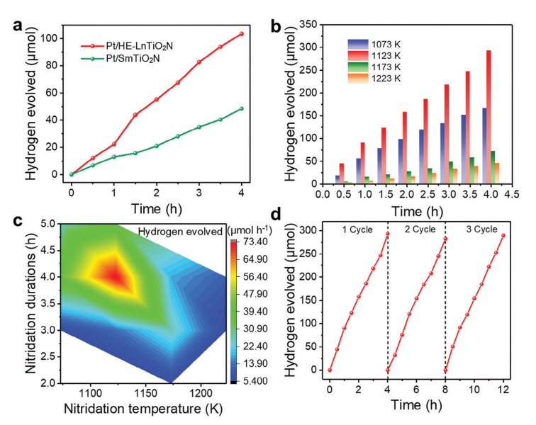 (a)在1173 K氮化温度下处理3小时制得的Pt/HE-LnTiO₂N和Pt/SmTiO₂N的光催化析氢时间曲线;(b)在1073–1223 K温度范围内氮化4小时后所得铂修饰高熵氮化产物的光催化析氢时间曲线;(c)在1073–1223 K温度范围内氮化2–5小时后所得铂修饰高熵氮化产物的析氢速率对比;(d)在1123 K氮化温度下处理4小时制得的Pt/HE-LnTiO₂N催化剂的光催化析氢循环测试。