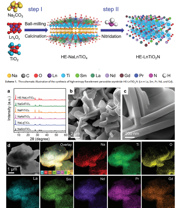 然后,将此高熵前驱体在流动的氨气中于1123 K下进行氮化处理,发现与传统合成单一元素氧氮化物(如SmTiO₂N)所需的苛刻条件相比,高熵前驱体能够在更低的温度和更短的时间内完成向纯相HE-LnTiO₂N的转化。这表明高熵设计带来的熵增驱动显著促进了氮化动力学,甚至使得在单一条件下难以形成的GdTiO₂N也能稳定存在于高熵相中。