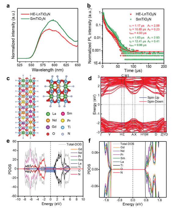 (a)HE-LnTiO₂N与SmTiO₂N的稳态光致发光能谱;(b)HE-LnTiO₂N与SmTiO₂N的时间分辨瞬态光致发光衰减光谱;(c) {LaSmPrNdGd}TiO₂N(HE-LnTiO₂N)模型的1×5×1超胞结构;(d)HE-LnTiO₂N能带结构的DFT计算;(e)计算得到的PDOS及(f)矩形区域的放大图示。