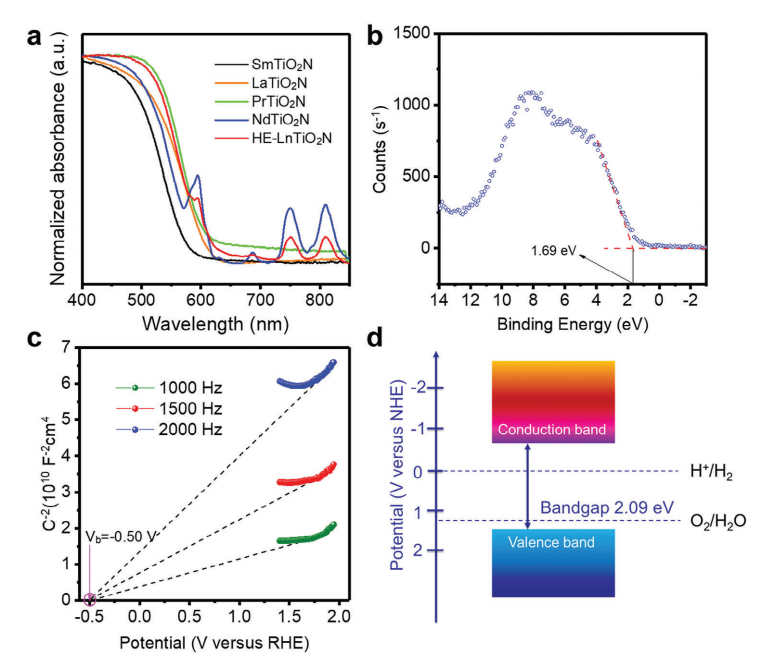 (a)HE-LnTiO₂N与LnTiO₂N(Ln = La、Sm、Pr或Nd)的紫外-可见漫反射光谱;(b)HE-LnTiO₂N的XPS价带谱;(c)HE-LnTiO₂N的莫特-肖特基曲线;(d)HE-LnTiO₂N的能带结构示意图。