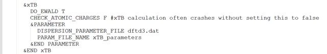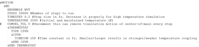在CP2K的输入文件中任务类型选择MD,理论方法采用GFN1-xTB,采用NVT系综,热浴采用CSVR,温度设为3500K(温度设置较高加快反应的进行),热浴TIMECON设为100,步数STEPS设为50000,步长TIMESTEP设为0.2,部分输入文件如图3所示: