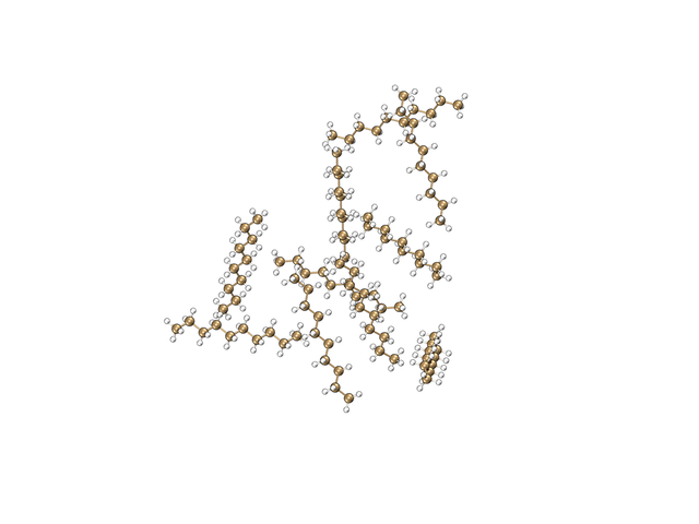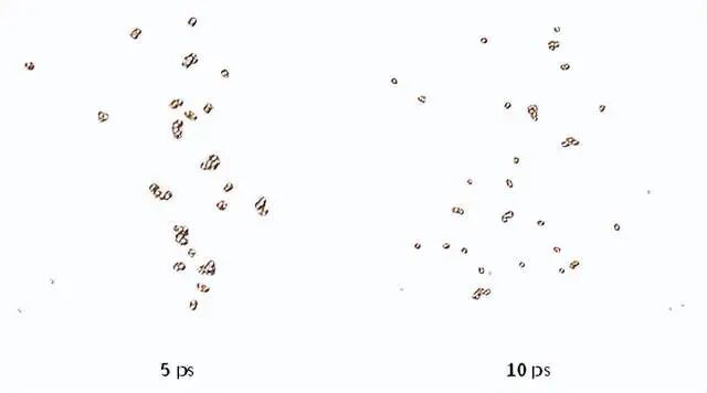 可以看到,随着模拟的进行,经过10 ps后,正葵烷被裂解为大量的小分子碎片。如图4所示,体系中不存在完整的正葵烷分子链。