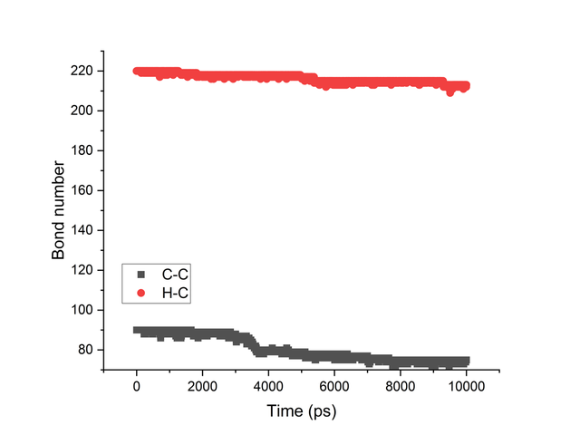 我们进一步考察体系中具有不同成键数的碳原子的数目变化(图5),可以看到,有100个C原子的成键数都是4,因为体系一开始所有的C原子都来自正葵烷,都属于sp3碳,10条正葵烷分子链总共是100个碳原子。随着模拟的进行,长链烃开始裂解,开始出现短链烃烷,烯烃和炔烃,因此C(4)逐渐减少,C(3),C(2)逐渐增多。C(1)和C(0)主要来自于一些不稳定的分子碎片。从图6也可以看出,C-C键和C-H键在数目在反应过程中也在逐渐减少。
