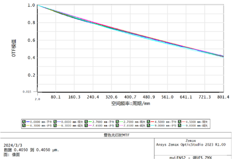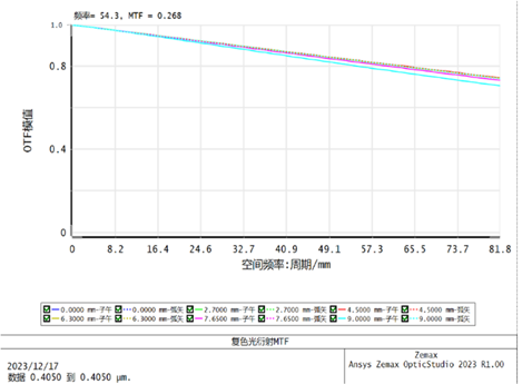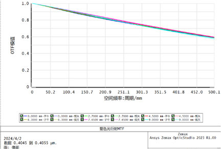 考虑到激光器输出存在微小线宽,团队在ZEMAX中进行色差分析:设置线宽1nm,以405nm为中心波长,添加404.5nm和405.5nm参考光。分析结果显示,全视场波像差均在0.25λ以内(图10),MTF虽有下降但仍≥40%(图11),系统对微小色差具备良好容忍度。