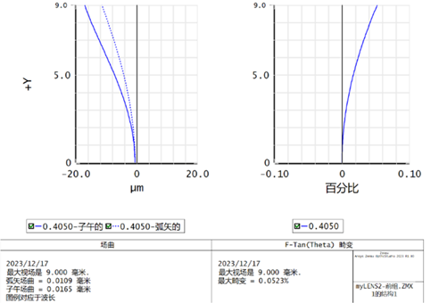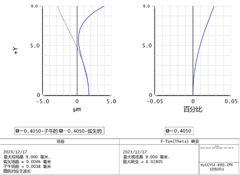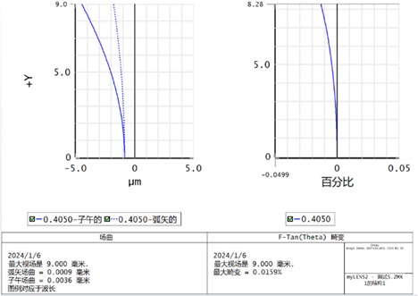 整体优化后,系统点列图RMS半径均在2μm以内(图7),截止线对数达标,分辨率实现0.625μm(图8),畸变降至0.0159%,最大子午场曲3.6μm(图9),完全达到设计预期。