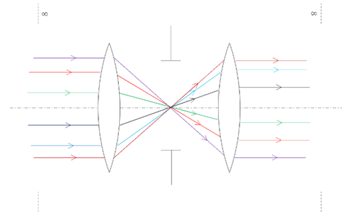 为解决基板离焦导致的倍率误差问题,该投影物镜采用双远心光路结构,整体类似4F成像系统。前组透镜的后焦面与后组透镜的前焦面重合,视场光阑位于该重合平面,分别将前组、后组透镜成像于物方、像方无穷远。这种结构能确保入射与出射主光线始终与光轴平行,即便物距或像距发生变化,系统放大倍数也保持稳定,为成像精度提供基础保障,其结构示意图如图1所示。