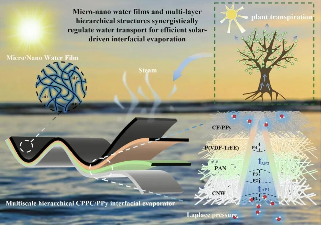 太阳能从液态水中提取水蒸气有望解决淡水短缺问题,但由于水在自然条件下的高蒸发焓,蒸发速率过低限制了其实际应用。本文以植物蒸腾作用为灵感,采用CNW/PAN/P(VDF-TrFE)多层织物,将聚吡咯(pyrorole)和聚多巴胺(dopamine)涂层碳毡逐层自组装,设计了一种多尺度分层梯度孔结构蒸发器。得益于微纳结构和界面效应的协同作用,不仅可以大幅降低系统的蒸发焓,同时保持显著的水/气界面,而且在梯度孔隙中形成的拉普拉斯压力可以有效调节水分的输运,从而在蒸发过程中防止水分在蒸发界面过度积聚,最大限度地减少热损失。因此,蒸发器在1个太阳下的纯水蒸发率为1.97 kg m−2h−1,在10 wt% NaCl溶液和真实海水中蒸发率为1.64-1.80 kg m−2h−1。春季室外的高纯水收集率为8.15 kg m−2 d−1。这项工作为缓解水资源短缺的高性能界面蒸发器提供了一条可扩展的途径。