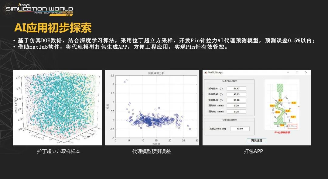 基于optiSLang软件建立Pin针高保真降阶模型,输出MOP model;实现Pin针拉力预测结果毫秒级输出,预测准确度99.9%以上。