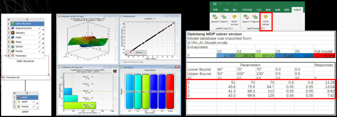 基于Ansys optiSLang软件建立Pin针高保真降阶模型,输出MOP model;实现Pin针拉力预测结果毫秒级输出,预测准确度99.9%以上