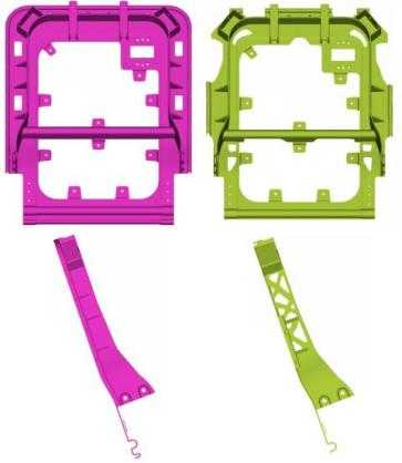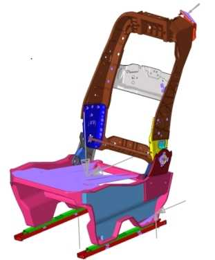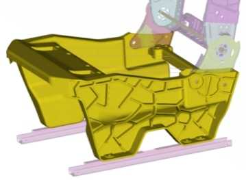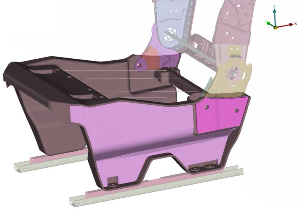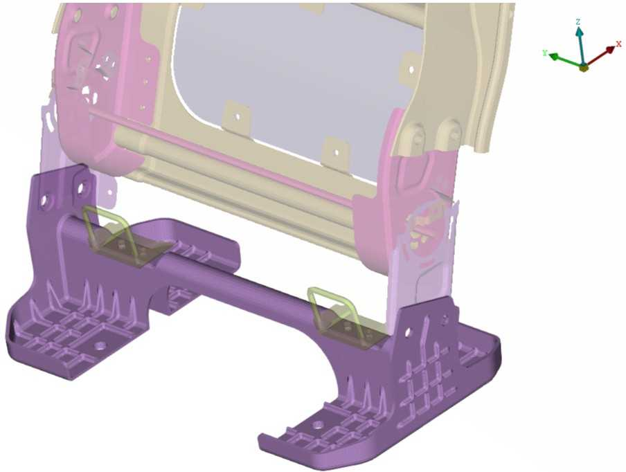 如第1章所述,座椅的性能分析工况包括静态刚强度、模态、动态冲击等数十种工况。在拓扑优化分析过程中,需要考虑优化效率和优化效果。包括优化迭代计算时间,收敛情况及优化结果合理性等。因此需要在数十种工况中选取关键工况做为拓扑优化分析时考察的工况。选取工况的主要原则是根据当前的性能状态,性能余量,工况的受力特点及历史分析数据结果等因素进行综合选取拓扑优化的分析工况。本文以某项目二排,三排座椅为例。该项目二排座椅坐垫骨架和靠背骨架,三排座椅脚架,靠背骨架和背板均为镁合金材料。二排、三排座椅骨架概念数据如图4和图5所示。