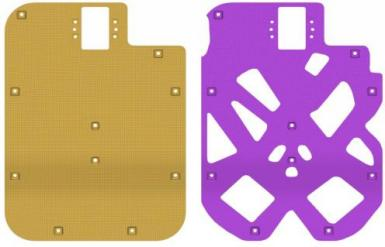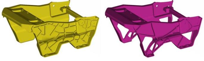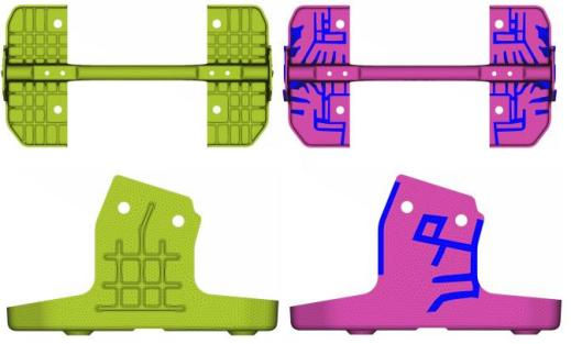 对于二排坐垫骨架和三排脚架,我们需要通过拓扑优化来确定最优的加强筋布置方式。因此,需要将优化空间进行包络填充。初始设计方案数据见图9和图10。填充拓扑空间后数据见图11和图12。