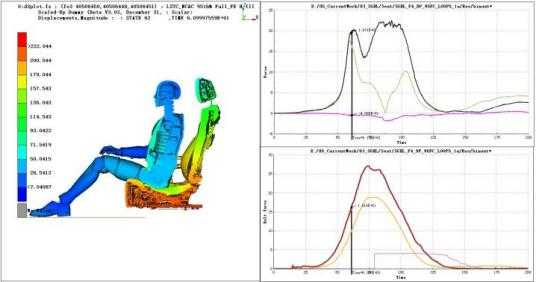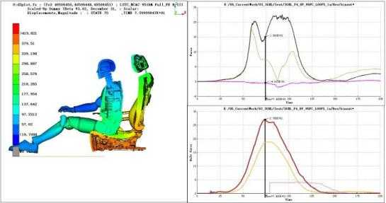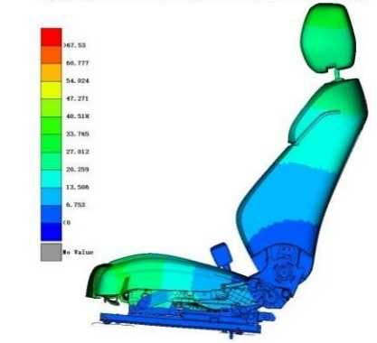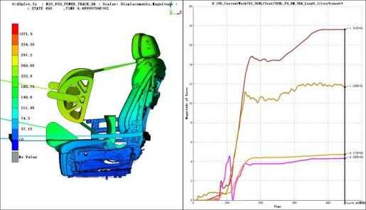 对于选取的关键工况中的动态冲击工况,需要将动态载荷大小及位置提取出来,加载到线性静态优化模型中。当座椅在概念设计阶段,还没有数据支撑进行整椅的仿真分析。因此我们可以通过参考相近座椅结构的历史仿真结果来做载荷的提取。以二排座椅为例,需要将95假人正碰工况和安全带固定点强度工况的载荷大小,作用方向和位置等边界条件提取到线性静态优化模型中,等效为线性工况进行拓扑优化分析。通过对座椅骨架在正碰工况和安全带安装点强度仿真工况的仿真结果分析,提取座椅坐垫骨架以及安全带安装点位置的极限受力状态时的载荷值以及受力位置做为线性静态优化分析工况的载荷边界条件。正碰工况受力状态下假人与座椅接触力及安全带受力结果见图6和图7。