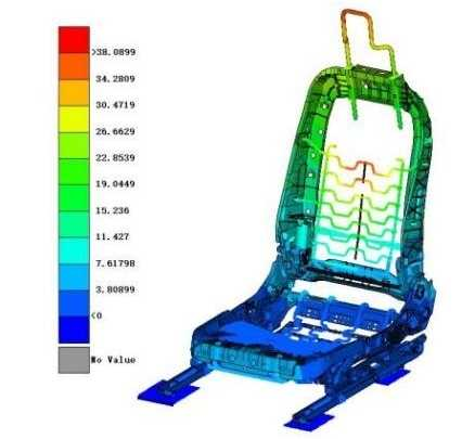 振动分析主要考察车辆行驶过程中的振动会对座椅的舒适性和乘客的乘坐体验产生影响。通过仿真分析,可以评估座椅在不同振动频率和振幅下的响应特性,并进行相应的优化设计。如图3所示,模态分析,模拟座椅骨架的振动特性。