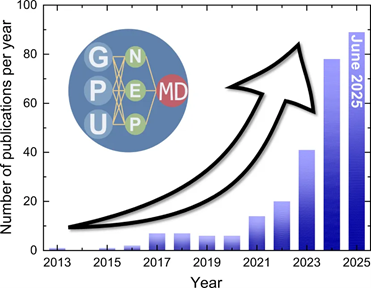 国内的渤海大学樊哲勇教授团队开发的GPUMD软件就是一款有竞争力的开源分子动力学模拟软件[1]。GPUMD支持多种经验势以及独具特色的神经演化势(NEP)机器学习势。截至2025年6月,使用GPUMD发表的论文数量连续两年获得接近100%的增长速率,引领同类原子尺度模拟软件。