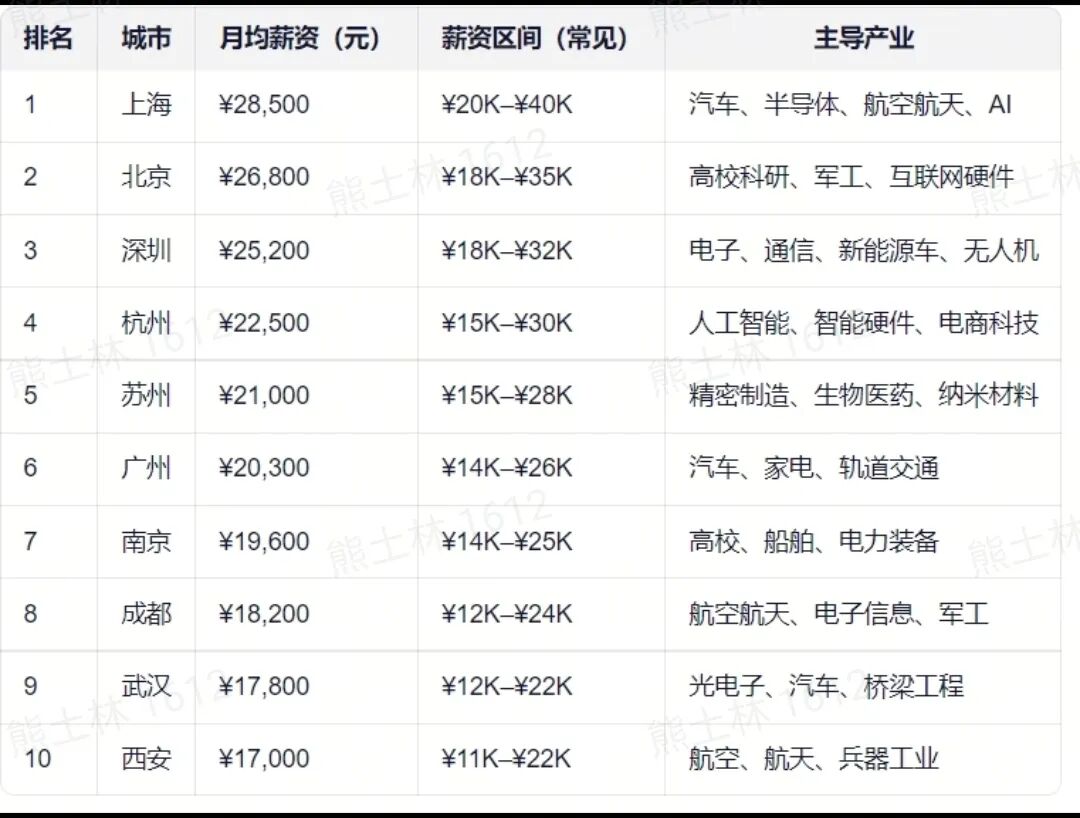 一线城市(北上深):高薪源于高端制造、科研及科技企业的集聚效应。北京依托航天航空(如航天科工)、科研院所(如中科院);上海侧重汽车(特斯拉、上汽)、半导体(中芯国际);深圳以科技制造(华为、大疆)为引擎。