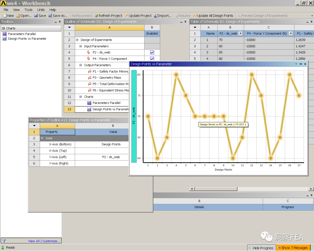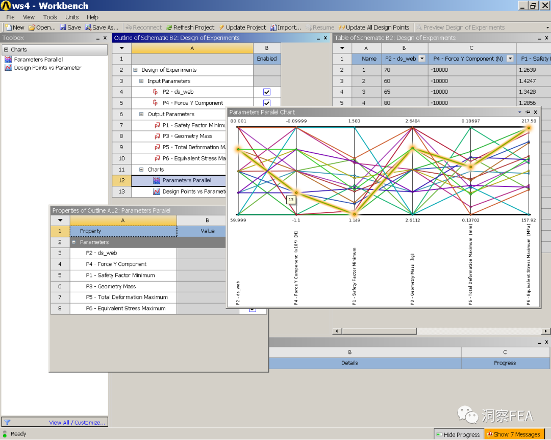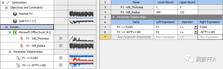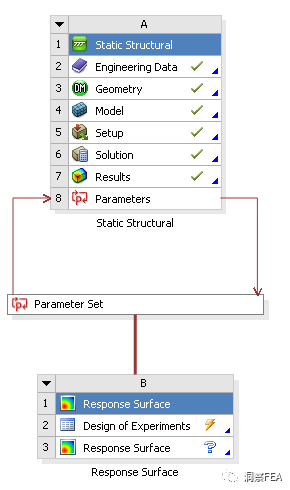 这并非个例。港口起重机设计中,工程师既希望臂架轻量化以降低能耗,又需保证承载时的屈曲稳定性;无人机研发中,气动布局优化要兼顾升力提升与风阻降低,而结构设计需在减重与抗冲击性能间找到平衡点。这类“目标冲突型”需求,正是工程师对优化设计工具最核心的关切点——如何在相互制约的指标中找到科学最优解,而非依赖经验的折中方案。 ANSYS Workbench(以下简称WB)是ANSYS公司开发的仿真应用集成工作平台,ANSYS WB环境提供了参数(Parameter)和设计点(DesignPoint)的管理功能。集成于WB中的ANSYS DesignXplorer模块(以下简称DX)则提供了强大的设计探索及优化分析功能。基于WB以及DX的分析结果,设计人员将能够识别影响结构性能的关键变量、确定结构的性能响应同设计变量之间的内在关系、找到满足相关约束条件下的优化设计方案。WB提供的Parameter Set功能可以实现分析项目中所有参数的管理,参数包括输入参数、输出参数以及用户定义参数等类型。在Parameter Set管理页面下的“Table of DesignPoints”列表则列出了一系列输入变量的不同取值和对应的输出变量的数值表,即:设计点列表。WB中的设计点(Design Points),就是一组给定的输入参数取值及其相应的输出参数取值,设计点实际上代表了一种设计方案。输入参数在其取值范围内变化和组合,可以有很多的设计点,这些设计点就构成成了一个设计空间。不同设计方案可以通过参数平行轴图来描述。利用设计点列表可以对设计点进行管理和选择更新设计点,或者选择鼠标右键菜单“Copy inputs to Current”将某个设计点复 制到当前设计方案,这样就可以在计算后在后处理程序里用图形查看此设计点的各种响应。实际上,WB的设计点功能通常是与DX功能结合使用。集成于WB中的DX提供了更为全面的设计空间探索工具和功能,也是本章将重点介绍的内容。DX提供的各种分析工具都是基于参数而展开,参数相关性分析用于研究哪些输入变量对输出变量影响最大,基于试验设计的设计点采样和响应面技术可以全方位地揭示输出变量关于输入变量的变化规律,目标驱动优化技术则基于各种优化方法来提供最佳备选设计方案;此外,DX还提供了用于确定输入参数的不确定性(随机性)对输出参数影响的6-sigma分析工具。通常,一个典型的WB及DX参数分析和设计优化过程主要包括如下的几个环节:首先,在ANSYS DX中,所有的设计探索和优化都是从建立分析模型开始。DX中的分析模型可以是涉及到单一物理场,也可以是多场耦合。模型中的各种参数(如:CAD参数、材料参数、载荷参数等)需提取为设计变量(或输入变量)。在进行有关分析后,提取有关的结果(如:应力、变形、频率、温度、总质量等)作为响应变量(或输出变量),用户也可以自定义参数作为输出变量(如:结构造价)。这样就实现了参数化的建模和结构分析。此时,可以通过WB的参数管理来查看参数或比较不同的设计点(设计方案),也可由Parameters Set进入到相关的DX系统或组件进行更深入的设计探索。对于结构中的输入参数较多的情况,DX提供了参数相关性分析系统(Parameters Correlation),该系统能提供变量之间的相关性矩阵以及输出变量关于输入变量的敏感性矩阵,这些方法能帮助设计人员确定哪些输入参数对设计的影响最重要(或最不重要),以便在后续设计探索和优化过程中识别出关键输入变量,以减少设计变量个数,提高后续响应面和优化计算的效率和精度。在确定了对响应最为重要的设计参数后,即可继续进入DX的响应面系统(Response Surface)中。首先需要在响应面系统的Design of Experiment组件(以下简称DOE)中指定输入变量(设计变量)的取值范围(最小、最大值)以定义设计空间。基于所指定的设计变量取值范围,DOE会创建设计空间的采样填充。DOE包含了一系列设计点采样方法,如:Central Composite Design(简称CCD)、Optimal Space-Filling Design(简称OSF)、Box-Behnken Design、Custom、Custom + Sampling、Sparse Grid Initialization、Latin Hypercube Sampling Design(简称LHS)等,其中缺省为CCD方法。随后,WB会计算DOE中形成的所有设计点。基于DOE中的设计点,每一个输出参数关于输入参数的响应面可通过参数回归分析方法得到。DX提供的响应面拟合方法有Standard Response Surface(完全二次多项式)、Kriging、Non-Parametric Regression、Neural Network及Sparse Grid,其中Standard Response Surface为缺省方法。一般来说,对于设计参数变化较为温和的情况,Standard Response Surface能给出较为满意的拟合结果;对设计参数强烈变化的问题,可尝试使用Kriging 响应面。响应面是输出参数关于输入参数的近似函数,其精度依赖于输出量变化的复杂程度、DOE中样本设计点数量以及响应面算法类型的选择等因素。需要指出的是,在ANSYS DX中参数扮演了很重要的角色,可以说所有的分析环节都是围绕参数而展开的。DX中常见的参数类型包括输入参数、输出参数和导出参数。输入参数可以是几何模型的长短、半径等尺寸参数,也可以是温度、压力等荷载或边界条件参数。DX的输入参数还有连续型、离散型之分。连续型参数取值范围是一个连续的介于上线和下限之间的实数区间,而离散型参数的取值范围被限定为若干个整数,开孔的个数、点焊的个数等都是典型的离散型参数。对于连续型输入参数,还可以指定Manufacturable Values过滤器。Manufacturable Values代表着实际制造或生产的限制条件,如钻头